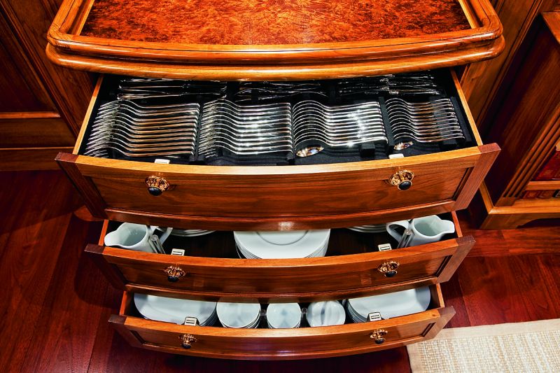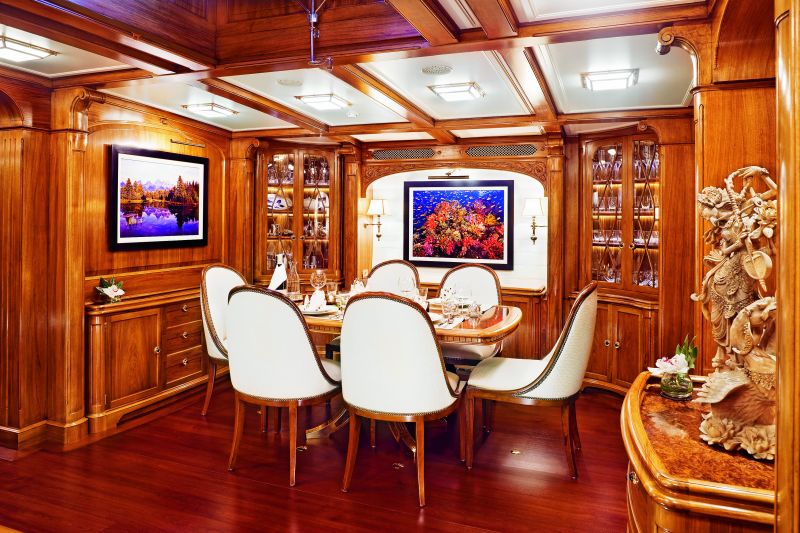 Из камбуза мы попадаем прямиком в гостевую столовую — она объединена с салоном и располагается в самой широкой части корпуса. В целом — типично английская обстановка: добротные деревянные панели, солидный диван, книжные шкафы, буфеты с хрусталем (так и хочется сказать — фамильным), стены украшает пейзажная живопись, причем часть пейзажей — подводные. При ближайшем рассмотрении один из «холстов» оказывается ЖК-экраном, который маскируется под картину, чтобы не нарушать ретро-имиджа интерьера.