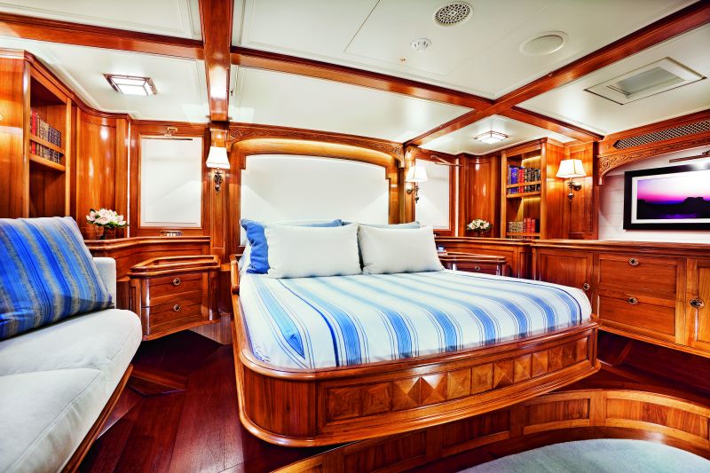 Отделка интерьера (Pieter Beeldsnijder Design) по всей яхте выдержана в едином стиле. Это классика: скругленные линии мебели, изящная резьба с элементами интарсии, латунные детали, бело-голубой текстиль. Потрясающему многообразию экзотических пород дерева, которые широко используются сегодня в яхтостроении, заказчик предпочел спокойные, теплые оттенки французского и американского ореха, а столешницы сделаны из капа. Современное оборудование вроде кондиционеров, телевизоров, CD и DVD-плееров так вписано в интерьер, что совершенно не бросается в глаза. Словом, на «Ханумане» максимально бережно воссоздана атмосфера былого — «золотого века» больших парусников.