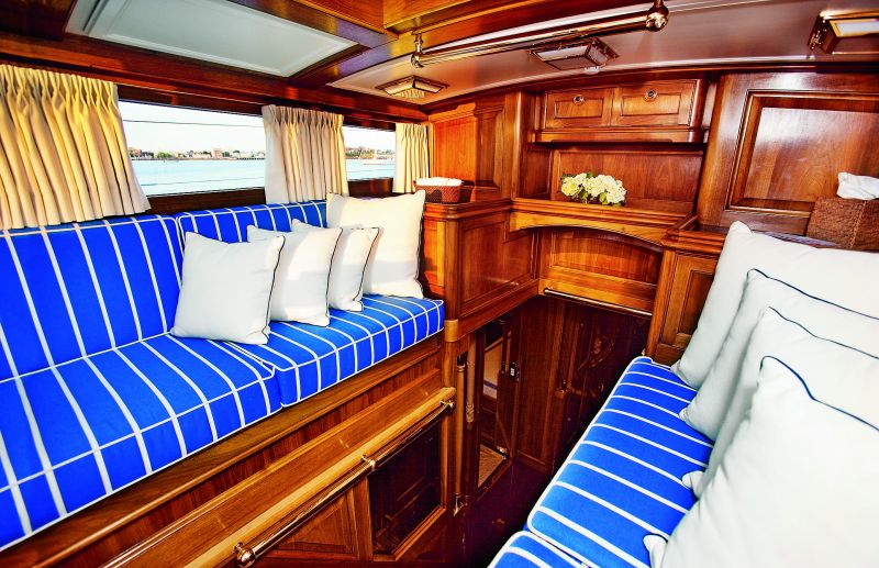 Особо просторным это помещение не выглядит, но и тесным его никак не назовешь. В самый раз, чтобы чувствовать себя уютно и в то же время не испытывать неудобств, передвигаясь внутри даже во время крена. Одно из фирменных ноу-хау верфи Royal Huisman — строить макеты всех интерьеров в натуральную величину, чтобы заказчик мог примерить, что называется, на себя, насколько жилые пространства будут соответствовать его личной эргономике. Так что прежде чем гостиная «Ханумана» была реализована в дорогих материалах, каждый ее сантиметр был просчитан и опробован, почти обжит будущим хозяином.