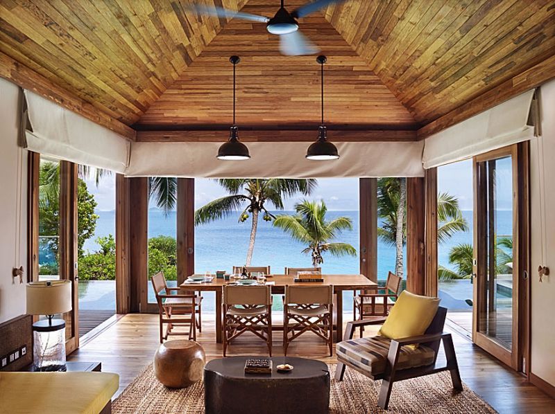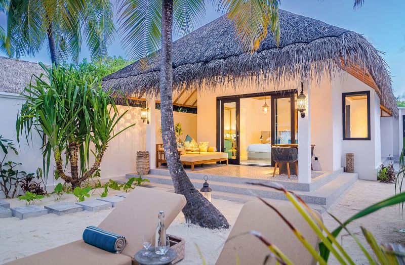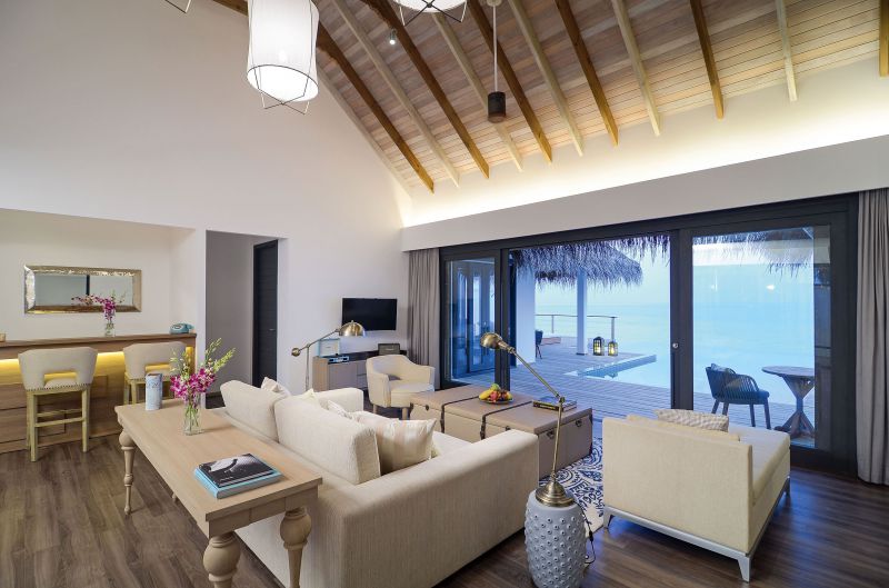 Дизайн отеля вдохновлен эпохой путешествий 60-х – 70-х годов прошлого века. На острове есть свой Палм-Бич, Сансет-Бульвар, воспетое «Роллинг Стоунз» Шоссе 66 и увековеченная «Битлз» Пенни-Лайн. 125 просторных вилл под тростниковыми крышами возвышаются на сваях над океаном в лагуне или скрыты в тени тропического сада на белоснежном пляже. Их элегантные интерьеры ненавязчиво намекают на атмосферу свободы и хиппи-движения.