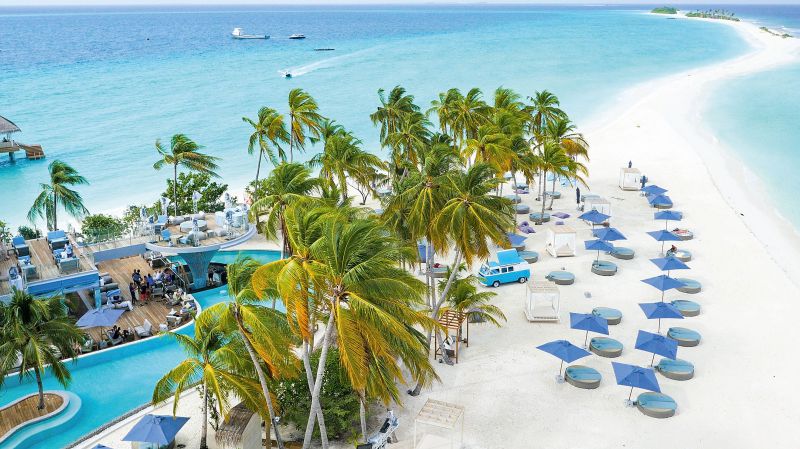 После 30 минут перелета из столицы Мале с борта гидроплана открывается райский пейзаж: чистейшая бирюзовая вода, голубое небо и самая длинная среди всех мальдивских курортов, фантастическая песчаная коса протяженностью 1800 м.