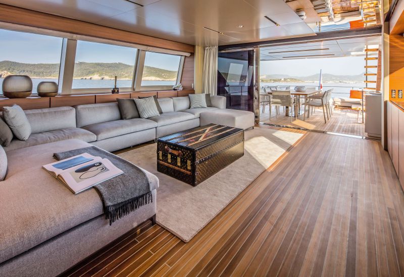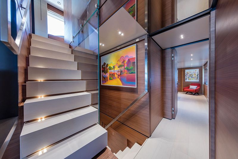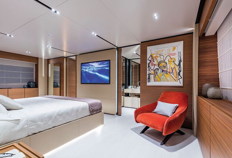 Таким образом, в распоряжении гостей – три каюты с двуспальными кроватями и одна с раздельными, все четыре, разумеется, с отдельными ванными комнатами, вместительными гардеробными и большими окнами. Владельцу отведен роскошный мастер-свит во всю ширину яхты в носовой части главной палубы.