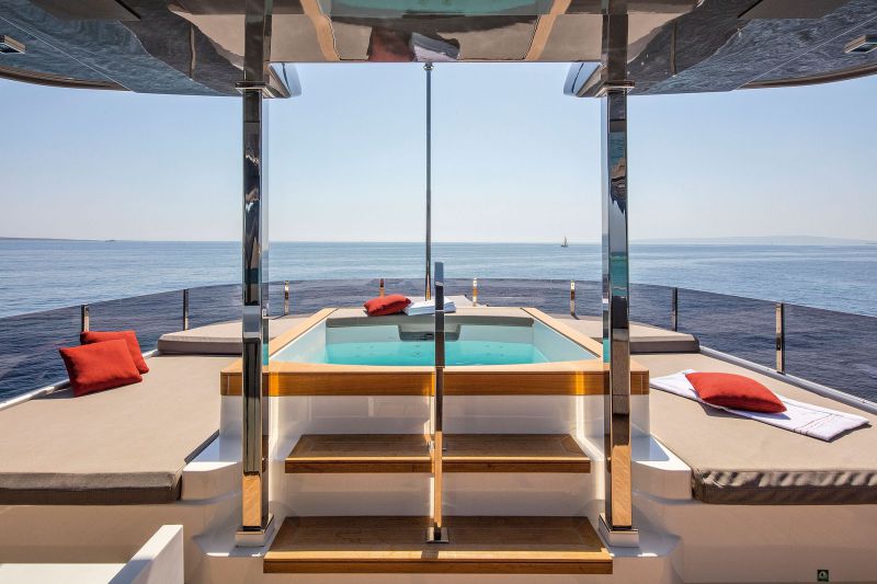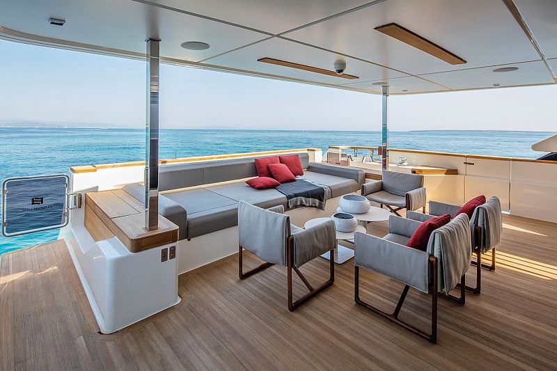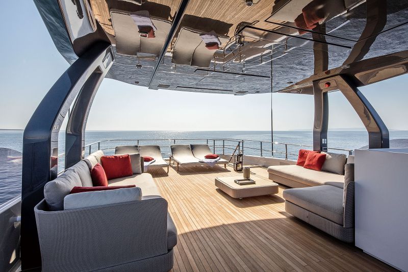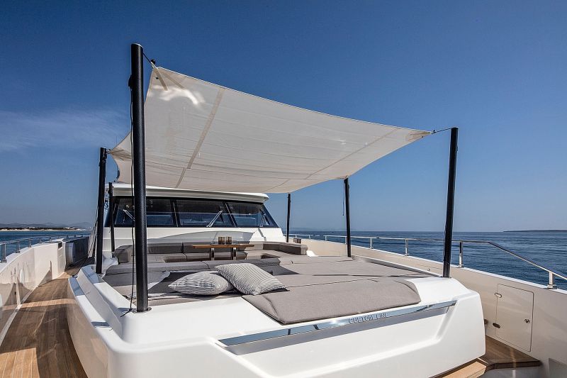 «В мире стало немножко больше красоты», – скромно начинается фирменный пресс-релиз о Navetta 33. Вовсе не «немножко»: к услугам владельца и гостей четыре палубы, одна из которых – один из самых просторных в классе сандеков, а в распоряжении капитана – невиданное в таком размере дело – отдельная каюта рядом с рулевой рубкой. Одно из главных достоинств всех яхт линейки Navetta – большие возможности для оптимизации обширных пространств. На открытых палубах можно устраивать хоть танцы, хоть дружеский ужин. Можно продолжить общение в основном салоне, раздвинув стеклянные двери, объединить его с кормовым кокпитом, создав впечатляющее пространство для вечеринки, к которому на стоянке прибавляется еще и широкий откидной балкон. На верхней палубе можно спланировать еще одну закрытую столовую или кинозал. Можно оставить побольше места на открытой палубе для вечеринок или поставить там обеденный стол, чтобы ужинать на открытом воздухе. В носовой части устроена еще одна полноценная зона отдыха с диваном, столом и площадкой для загорания, при этом вся она укрывается от солнца навесом, растягиваемым на опорах из углепластика. Это прекрасный уголок для отдыха вдали от любопытных глаз, когда яхта пришвартована кормой.