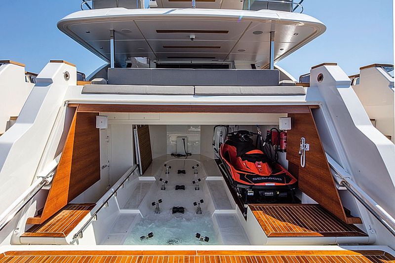 Еще одна фирменная фишка новых Custom Line, использованная на Navetta 33 – запатентованный Ferretti Group транец Dual Mode Transom, который может открываться вверх, если нужно спустить на воду тендер, или вниз, чтобы получилась огромная платформа для купания. Гараж вмещает в себя пятиметровый динги и гидроцикл.