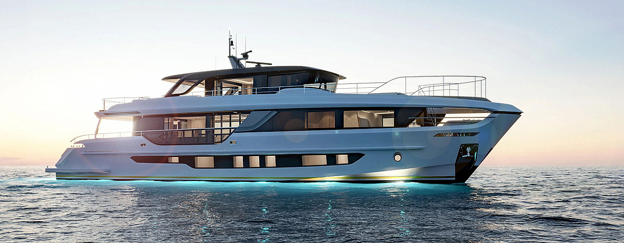 Хотя официальная мировая премьера должна пройти на Dubai International Boat Show в феврале-марте следующего года, своеобразный предпоказ Majesty 100 Terrace состоялся в Каннах этой осенью, и уже там было заказано три корпуса данной модели. Экстерьер и интерьер 32-метрового судна разработаны голландской Phathom Studio, морскую архитектуру спроектировало шведское бюро Profjord AB. Отличительной особенностью дизайна является приватная терраса в носовой части главной палубы: примыкая к мастер-каюте, она расширяет личное пространство владельца, предоставляя ему великолепный обзор на 270 градусов. В открытой части верхней палубы оборудованы солярий и джакузи, а в застекленной надстройке расположены скайлаунж и дополнительный пост управления. Яхта рассчитана на десятерых пассажиров. Ее максимальная скорость составляет 23 узла.