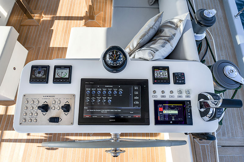 Длины хардтопа хватает, чтобы укрыть от солнца два поста управления с мягкими диванами для рулевых. Под этими сиденьями, к слову, спрятаны спасательные плоты. Стоя или сидя за штурвалом, легко дотянуться до пары электрических лебедок, которые установлены на комингсах по обоим бортам таким образом, что шкоты, собранные в органайзеры, не мешают отдыхающим.