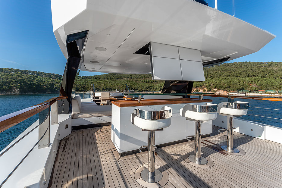 Принимать солнечные ванны можно и на верхней палубе: на фордеке имеются огромный лежак и две широких софы, на кормовой террасе — шезлонги (в походном режиме они уступают место гидроциклам, потому что именно здесь установлен кран для их погрузки/выгрузки). Кроме того, под свесом сандека разместили обеденный стол для трапез альфреско. Верхний салон с окнами от пола до потолка может служить не только лаунжем для релакса, но и кинотеатром. Переднюю часть надстройки занимает ходовая рубка.