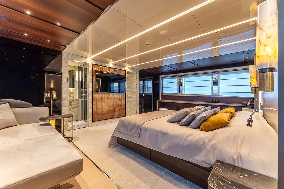Вся носовая часть главной палубы отведена под мастер-люкс с кроватью king-size, небольшим лаунжем с тахтой и креслом, мини-офисом и, конечно, гардеробной и ванной комнатами.