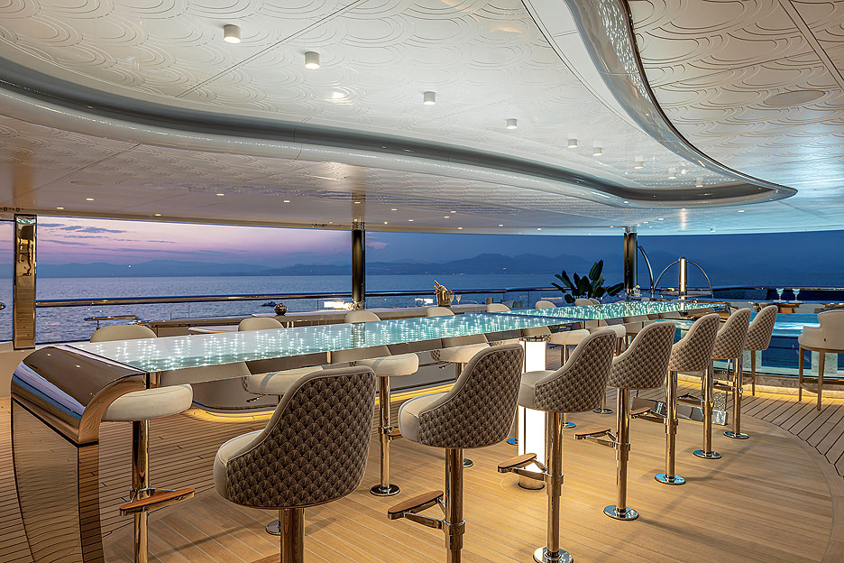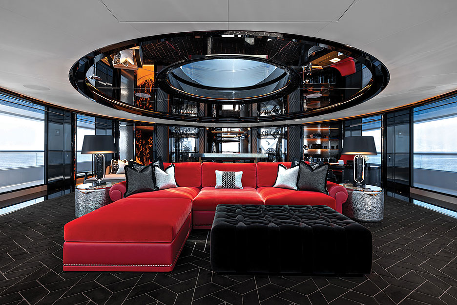 Тем временем Эндрю Лэнгтон и Макари, у которых был опыт в автомобильном дизайне, придумывали декор личной палубы владельца. У них получилась довольно строгая технофантазия из стекла, металла и сверкающих поверхностей с черными и красными акцентами. Самой экстравагантной деталью приватного салона стал карбоновый рояль Bogányi необычной обтекаемой формы, настоящий спорткар с клавишами.