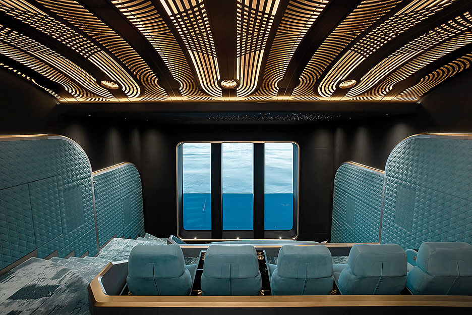 Для просмотра кино в компании гостей предусмотрен отдельный зал, обустроить который стало одной из самых сложных задач. Дело в том, что Шахид Хан любит смотреть кино в атмосфере «Великого Гэтсби». В прошлый раз просмотровый зал располагался рядом с главным салоном и был оформлен в стиле американского ар деко, а теперь его спустили ниже ватерлинии. Экран поднимается, и тогда сквозь три окна становится виден подводный мир. Инженеры Lürssen давно выработали спокойное философское отношение к самым необычным пожеланиям клиентов. Однако заявленные размеры окон в подводном кинотеатре вызвали у них легкую оторопь. Ширина 1,1, а высота 2,8 м — это ведь не косметические изменения, не стены золотом покрыть. Тут на первый план выступают соображения безопасности. Какой фантастической прочности (и при этом с идеальной видимостью!) должно быть стекло… А если в него врежется крупная рыба или льдина? Пришлось полтора года испытывать различные сорта стекла, специально изготовленные по заказу верфи. В итоге остановились на 15-сантиметровом многослойном стекле.