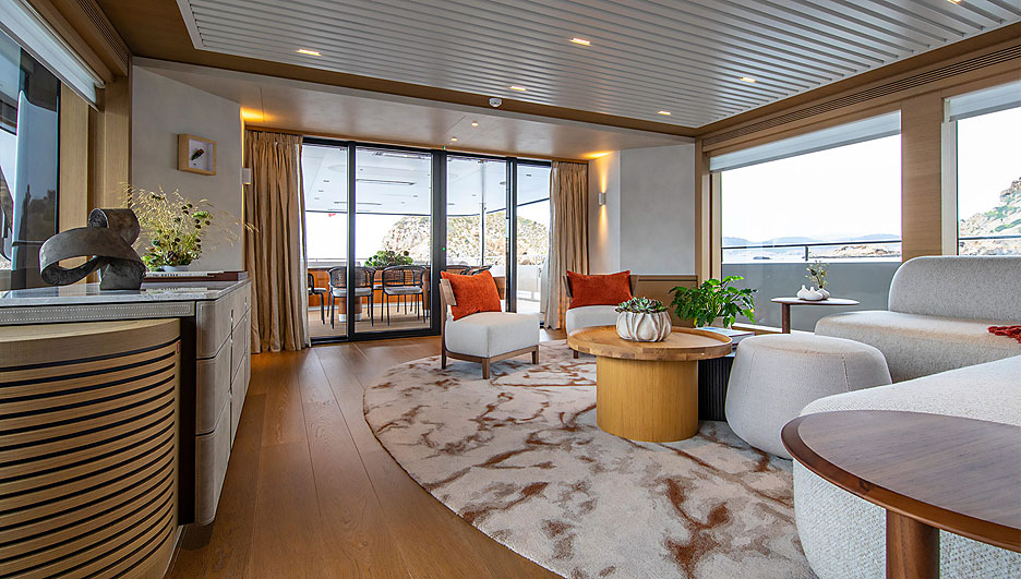 Интерьер также был создан Гвидо де Гротом в тесном сотрудничестве с владельцами. Стиль яхты отражает радостный ритм жизни — недаром проект первоначально получил название Project Samba. Результатом стал потрясающий плавучий оазис, воплотивший дух дома на берегу моря, с теплой палитрой кремовых и светло-коричневых тонов, обилием дерева с красивой текстурой и удобной мебелью изогнутых форм.