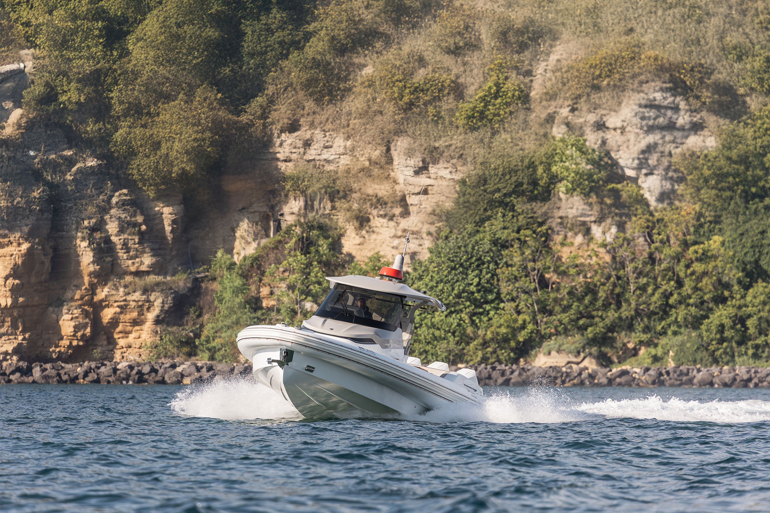 Длина лодки составляет 13,5 метров, а ее мощь обеспечивается тремя двигателями Mercury Verado V10, каждый из которых развивает 400 лошадиных сил. Этот макси-RIB разработан под руководством всемирно известного яхтенного дизайнера Кристиана Гранде.