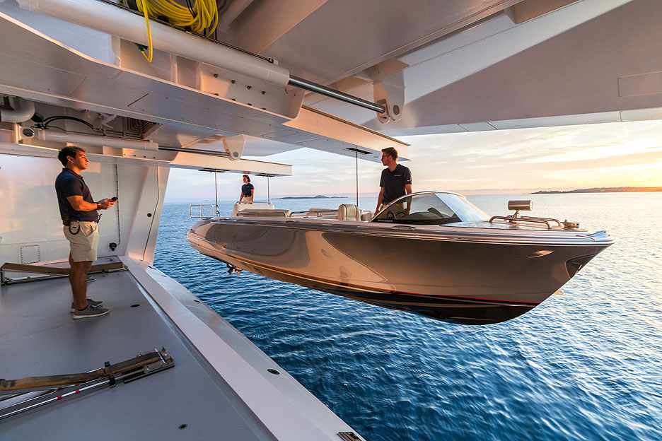 Кормовая часть Broadwalk — нечто большее, чем просто транзитное пространство, ведущее в главный салон. Внутри корпуса отведено место под пляжный и фитнес-клуб с дайв-центром и всевозможным снаряжением для водных видов спорта и рыбалки. Здесь находится один из нескольких баров, большой телевизионный экран, два полукруглых дивана и большой светильник из стразов Swarovski. Оборудование аккуратно расставлено и красиво подсвечено. Помещение выглядит привлекательно даже на ходу яхты при закрытых дверях. Что уж говорить о том, когда на стоянке опускаются задняя и две боковых панели!
