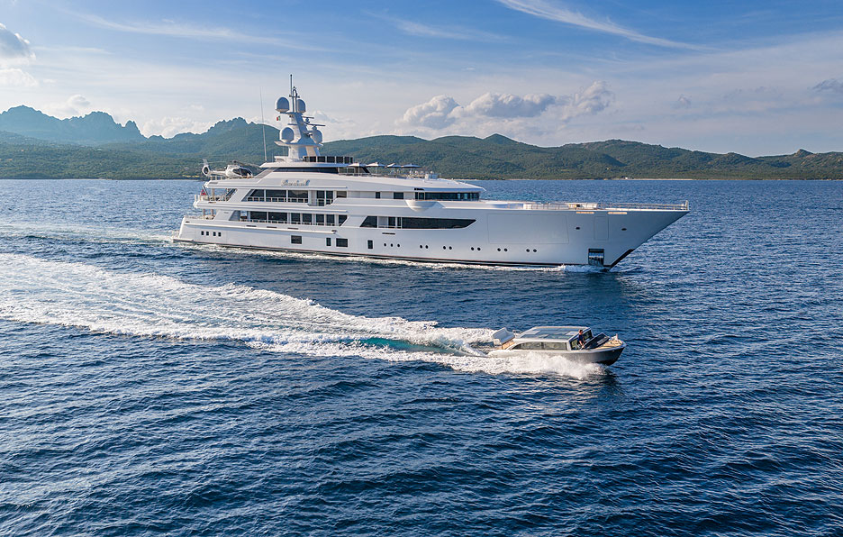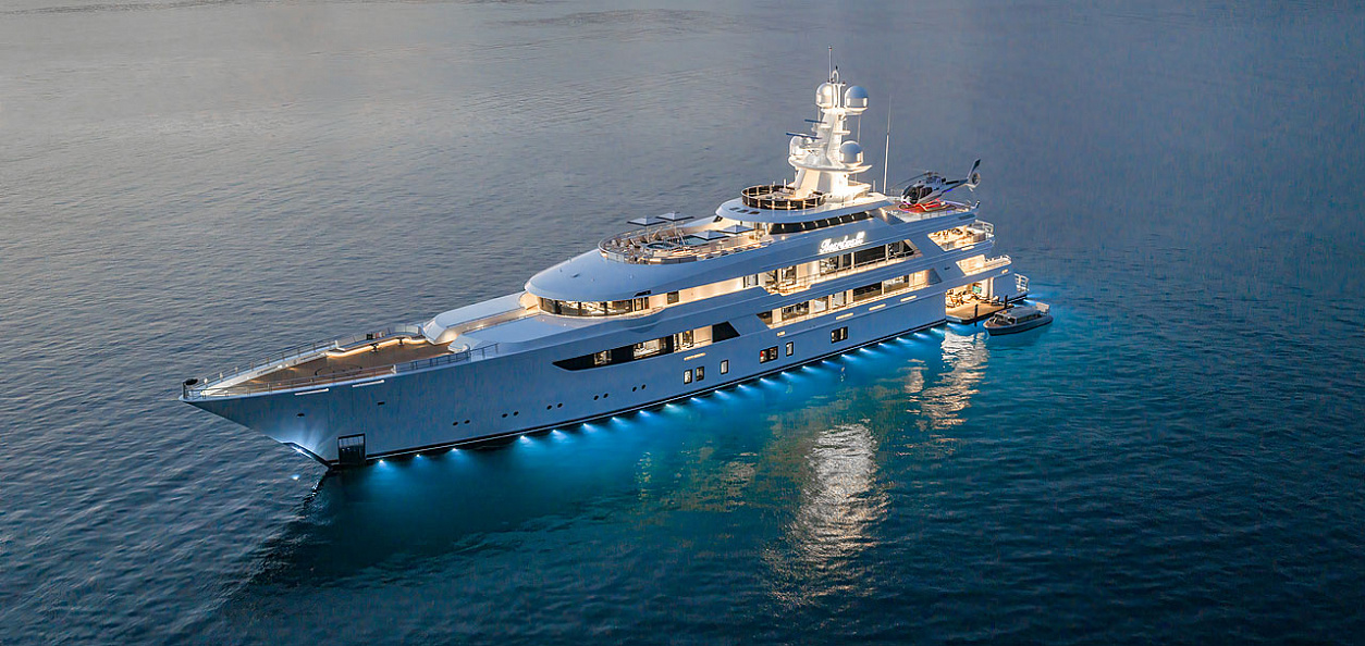 Несмотря на значительный объем и ширину в 12,5 м, Broadwalk выглядит стройной и длинной. Передняя часть главной палубы занята гаражом, в котором помещается пара великолепных тендеров длиной 8,5 м (открытый и лимузин) от старейшего судостроителя США Hodgdon Yachts и морского архитектора Майкла Питерса.