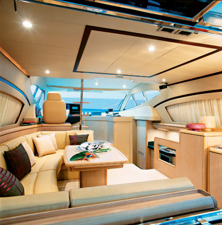 Простота управления позволяет шкиперу расслабиться и приятно провести время с друзьями. Рубка — своего рода малая гостиная с диваном и столиком под боком. Другая гостиная в кокпите, о чем напоминает откидной стеклянный столик возле переборки, отделяющий кормовую площадку от салона (опять-таки фирменный знак). Салон огромен: он занимает все пространство от кокпита до поста управления, а благодаря сплошной стеклянной стене и прозрачным перегородкам кокпит и рубка тоже включены в этот не салон даже — зал. Разумеется, полированная мебель и мягкая манящая кожа диванов. Здесь более всего может проявиться индивидуальность владельца: на его усмотрение и вкус оставлен выбор между панелями из дуба или ореха, различными фактурами (корень или ствол дерева), между темной протравкой и краской цвета металлик.