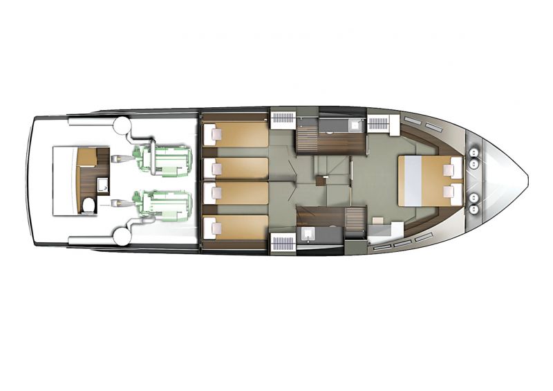 Элегантный стремительный силуэт, заводной характер и скорость прилагаются. В зависимости от выбранных двигателей суммарной мощностью от 1150 до 1420 л. с. Targa 50 GT развивает скорость от 30 до 33 узлов. Это по максимуму. Ну а если вы никуда не торопитесь, на более экономных с точки зрения расхода топлива скоростях яхта обеспечит длинное автономное плавание.