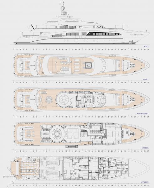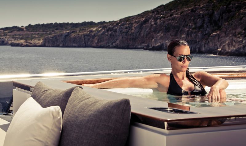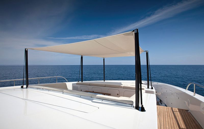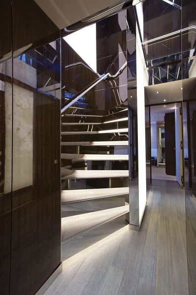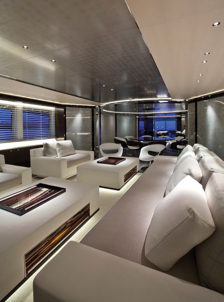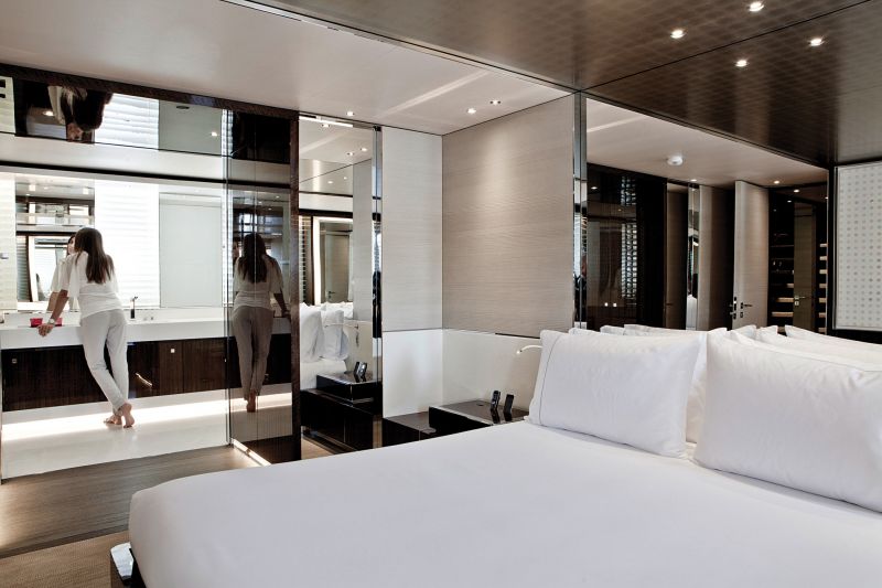Положение перегородок в главном салоне тоже можно менять, регулируя объем проникающего света. В кормовой части салона располагается бар, поверхность которого выполнена из оникса и подсвечена изнутри. а верхней палубе C-образный диван и пара кресел (их, кстати, можно объединить в софу) гармонично вписываются в плавные линии интерьера. Настроение помещения легко меняется благодаря раздвигающимся перегородкам из эбенового дерева или палладия, а также шторам. Здесь тоже есть свой бар, а телевизор изящно вмонтирован в зеркало. При этом центральная часть потолка сделана из тонких слоев палладия, а боковые — из древесины белого клена.