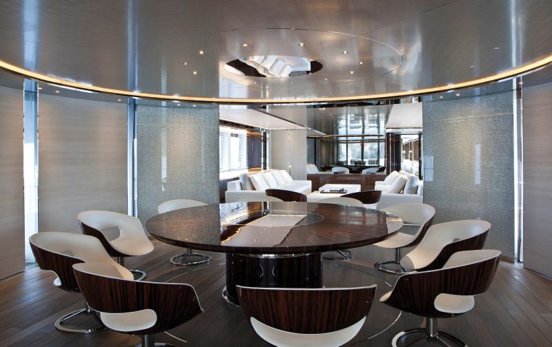 Круглый обеденный стол с вращающейся центральной секцией — логический центр столовой. Эта зона отделяется перегородками, сделанными вручную из стеклянной крошки. Использование натуральных материалов давно считается признаком хорошего вкуса, но теперь в моду вошли еще и нестандартные сочетания. Так, например, полупрозрачные шторы на борту Satori содержат вкрапления конского волоса с вплетенными стальными нитями. Стулья в столовой созданы по индивидуальному заказу. Внутри обиты белой кожей, снаружи отделаны зебрано и установлены на основание из отполированной стали. Кроме того, они обладают своеобразной «памятью». После того как гости покидают стол, повернутое кресло само возвращается в исходное положение. Реми Тессье лично демонстрировал функциональность обеденного стола, опустив его уровень во время смены блюд и превратив в большой кофейный столик.
