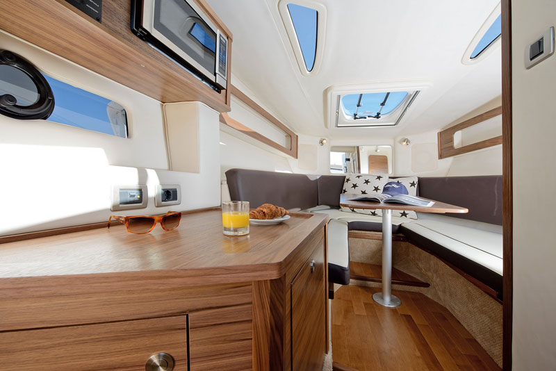 Главные изменения коснутся кокпита и в первую очередь рулевого поста. Теперь вместо традиционных стрелочных указателей лаконичную приборную панель 265-го можно будет значительно осовременить – с помощью дисплеев Simrad, на которые будут выводиться не только параметры работы мотора, но и данные эхолота и GPS. Традиционные тумблеры включения систем заменят кнопки – как у более дорогой старшей модели 320 Sundаncer. Капитанское сиденье осталось двухместным, что оценят и те, кому нравится рулить лодкой, обнимая сидящую рядом подругу (супругу), и те, чья харизма и остальные части тела не умещаются на стандартном сиденье. Но теперь спинка кресла стала подвижной, что добавило удобства гостям на втором ряду дивана, сидящим у стола. Напомню, что под этим диваном может находиться еще один холодильник. Вся зона вокруг тикового стола за постом управления легко превращается в пространство для загорания – стол опускается и закладывается подушкой, спинка кормового дивана откидывается – и лаундж готов. Вторая зона для загорания есть на носу лодки.