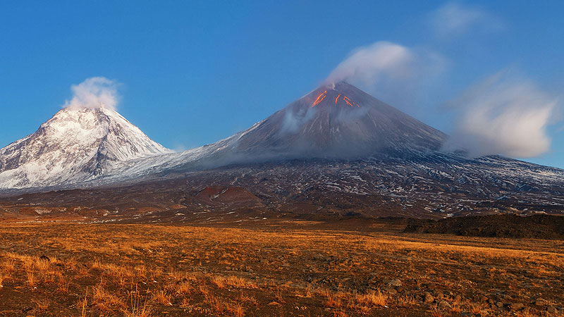 На третий день путешественников ждет трип к Ключевской группе вулканов – одной из самых активных сейсмических площадок не только на Камчатке, но и в мире. Здесь всегда что-то кипит и происходит: то Ключевская извергает лаву, то Толбачик взрывает землю, создавая невиданные инопланетные ландшафты. Все это как нельзя лучше служит декорациями для авантюрных селфи. Из иллюминатора вертолета открываются завораживающие виды на всю группу вулканов – это исполины, более 3000 метров высотой каждый. Эти вершины покрыты снегом даже летом. Вертолет облетает легендарную Ключевскую сопку и садится на склоне вулкана Толбачик. На вершине вулкана можно проделать знаменитый фокус: погрузить деревянную палочку в землю на глубину всего 10 см… В чем же волшебство? Через минуту палочка вспыхнет, словно ее сунули в самое пекло, а ведь этому вулканическому конусу уже более 40 лет! Но вокруг – совсем молодые поля лавы, вулкан извергался в 2013 году. Несложно представить, что под этой черной коркой – настоящий жар ядра Земли.