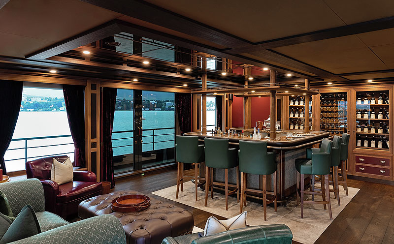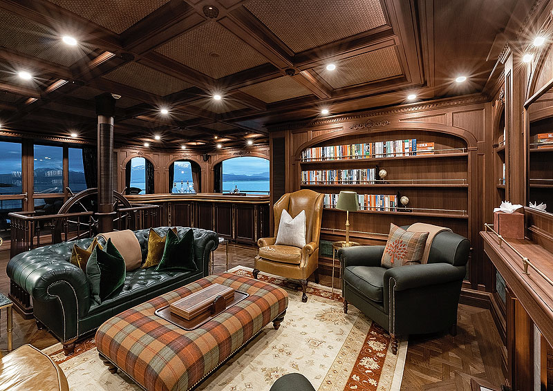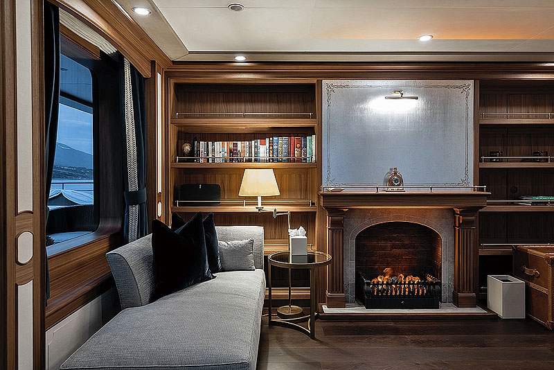Интерьер тоже выполняли в студии RWD. Так как яхта планирует путешествия в суровых условиях, внутри ее оформили предельно тепло и уютно – в стиле высокогорных шале с обилием деревянной мебели, мягкими тканями и пледами, паркетом и камином в главном салоне. В одном из лаунджей установили классический бар с огромным винным шкафом на сотни бутылок.