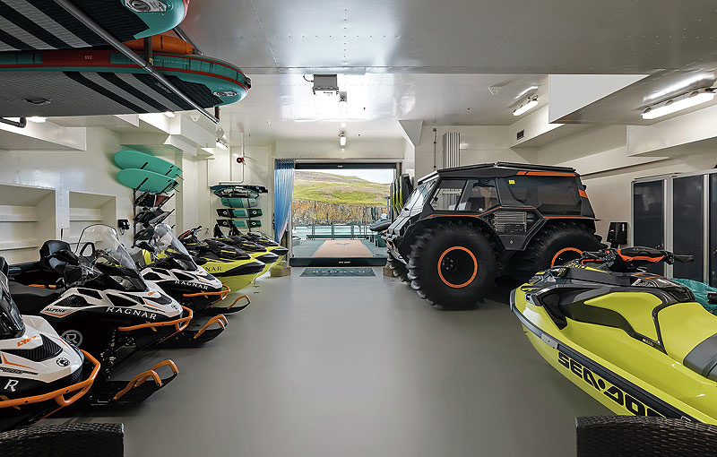 В результате конверсии Ragnar стала единственной суперъяхтой в мире, которая соответствует регламенту LY3 и сертифицирована как Ice Class 1A Super. Это значит, что она может выдерживать температуру воздуха до минус 35 градусов по Цельсию и идти на скорости четыре узла во льду толщиной до полуметра. Говорят, изначально владелец хотел увеличить длину яхты за счет платформы на корме, но тогда ему пришлось бы заново проходить сложную сертификацию. Вместо этого на борту теперь есть надувной удобный пляжный клуб – места для хранения занимает мало, но при этом очень комфортен для гостей, желающих проводить больше времени у воды.