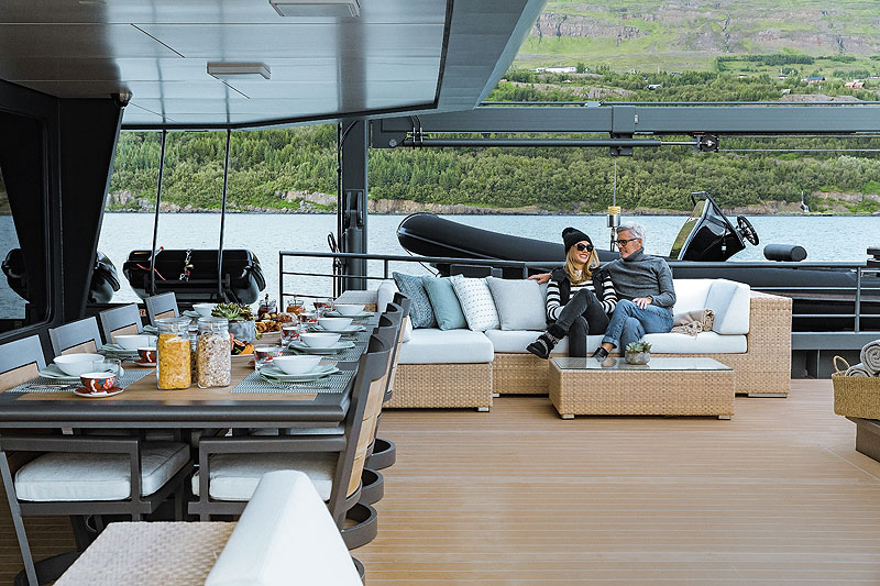 Еще одна впечатляющая черта прежнего Sanaborg – огромная открытая корма за счет сдвинутой к носу надстройки. Инженеры в процессе конверсии застроили ее так грамотно, чтобы вместить как можно больше «игрушек». С их помощью гости могут отправиться исследовать как море и острова с тайными бухтами, так и высаживаться на берег и даже погружаться под воду. Схожий арсенал есть далеко не у каждой суперъяхты длиной до 70–80 метров. Про сертифицированную полноценную вертолетную площадку и говорить не стоит. Рядом с ней оборудована специальная комната с обогревом. Она нужна для того, чтобы гости, вернувшись с катания на горных лыжах и фрирайда, могли оставить мокрые вещи на просушку и отправиться прямо отсюда в спа на нижней палубе. Еще на главной палубе есть джакузи.