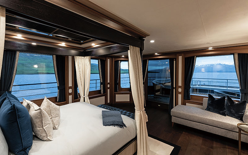 Планировка яхты – нестандартная, что в общем-то соответствует ее внешнему виду. Оригинальный кубрик и вспомогательные зоны в носовой части главной и на верхних палубах практически не меняли, а те, что ближе к корме, напротив, расширили. Там оборудовали салоны и гостевые каюты. Сверху добавили отдельную палубу – исключительно для владельца. Помимо двух просторных мастер-суитов с ванными, здесь находится панорамный лаундж и открытая терраса на высоте трехэтажного дома над водой. В общей сложности с 1500 гросс-тонн валовый тоннаж Ragnar вырос до 2450 гросс-тонн, то есть более чем на 50 процентов. Только снаружи в распоряжении гостей больше 550 квадратных метров пространства.