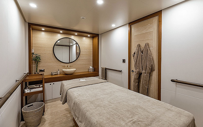 Конверсия на Icon Yachts состояла, конечно, далеко не только в изменении внешнего облика судна. Инженеры и дизайнеры работали над тем, чтобы расширить гостевые зоны. Надстройке придали больше объема, на нижней палубе оборудовали просторный спортзал, спа с хаммамом, сауной и массажным кабинетом, а также добавили места для хранения продуктов и вещей и расширили технические помещения, чтобы команде было удобнее обслуживать судно.