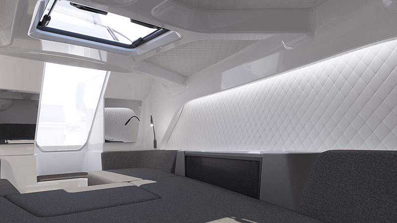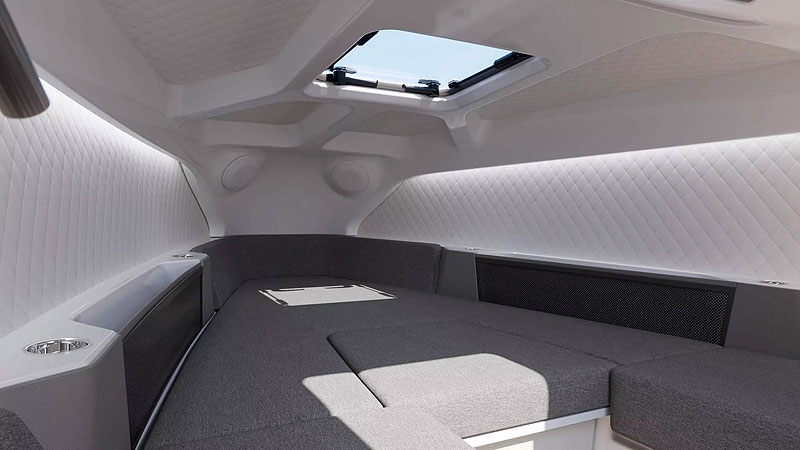 C-8 соответствует уровню традиционного скоростного катера премиум-класса. Его просторный кокпит вмещает восемь пассажиров. В носовой части находится каюта с туалетом, достаточно просторная, чтобы разместить двоих взрослых и двоих детей.