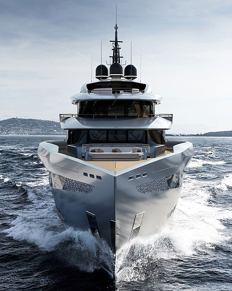 В экстерьере 85-метрового концепта Armand, разработанного компанией Officina Armare, есть что-то из автомобильной стилистики: рисунок линий остекления, плавный изгиб фальшбортов у кормы и перфорированные вставки в районе пляжного клуба. И в то же время он производит впечатление величественного корабля — почти космического! Интерьер пленяет запредельной роскошью, причем высокотехнологичной. Так, вертолетная площадка может менять размеры, а вогнутые экраны на стенах кормового лаунжа позволяют погружаться в 180-градусные виртуальные панорамы. К услугам 18 взыскательных пассажиров стеклянный инфинити-бассейн и винный погреб, а в гараже помимо солидного арсенала водных игрушек есть даже глубоководный аппарат U-Boat Worx SuperSub последнего поколения.