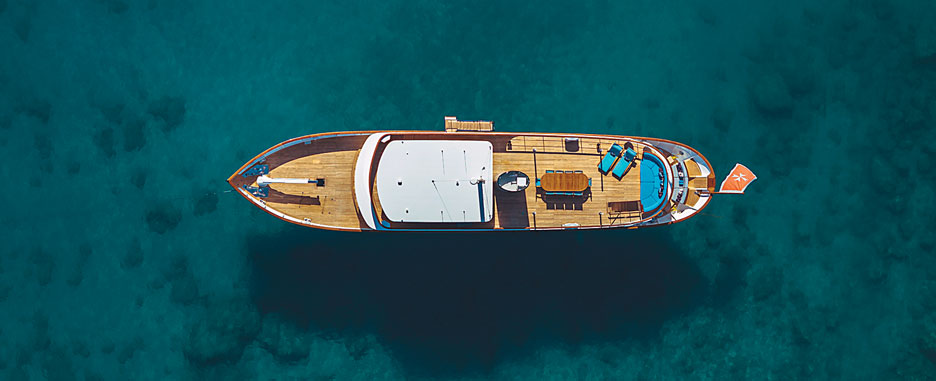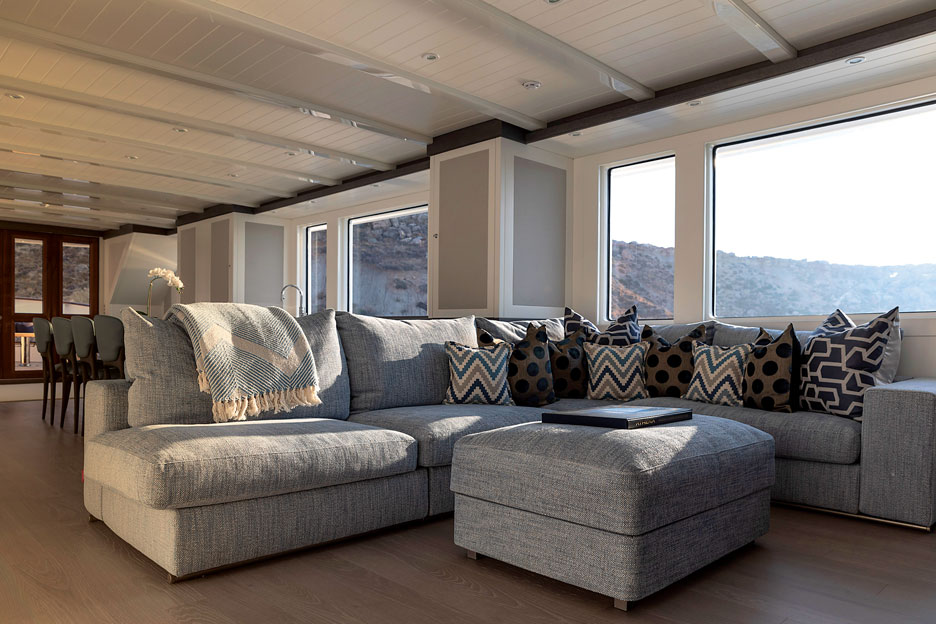 На верхней палубе расположены навигационная рубка, небольшой скайлаунж с функцией кинотеатра и открытая зона отдыха. Выкрашенная в яркий желтый цвет дымовая труба смотрится здесь как арт-объект. Над столом на 10 персон, предназначенным для обеда на свежем воздухе, можно установить легкий тент на штангах, а шезлонги и диван в виде полумесяца остаются на солнце — там удобней всего загорать.