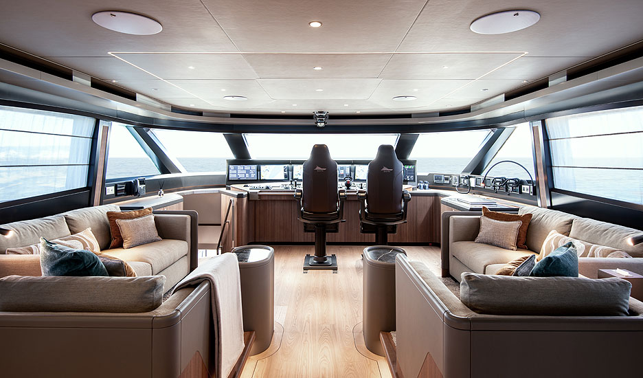 Свесы четырех палуб образуют великолепные наблюдательные пункты, где гости могут устроиться поудобнее и следить за захватывающей борьбой человека с рыбой. На основной палубе тоже есть зона отдыха с большим столом для ужина на свежем воздухе, где можно отведать только что пойманный трофей. А по соседству расположена пара диванов, обращенных к корме и смотрящих на кокпит внизу. Эта зона, отделенная стеклянной перегородкой, чтобы не портить вид, получила название «небесная ложа».