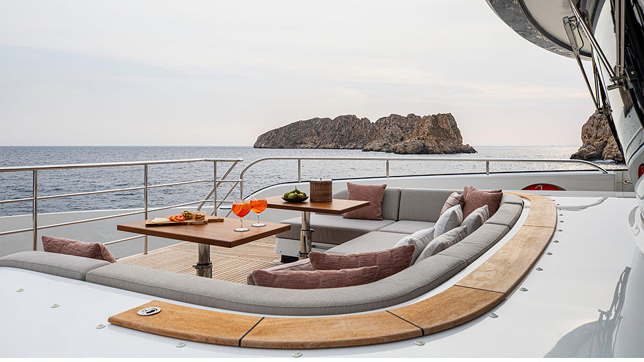 Купальная платформа может похвастаться погружной центральной частью и длинным телескопическим трапом, который выдвигается из правой лестницы, ведущей в кокпит. Удобно сходить с пирса прямо к главному салону. За транцевой панелью расположен пляжный клуб с сауной, баром, комодом, где можно хранить спортивное снаряжение, и большим свободным пространством, которое можно обустроить по своему вкусу.
