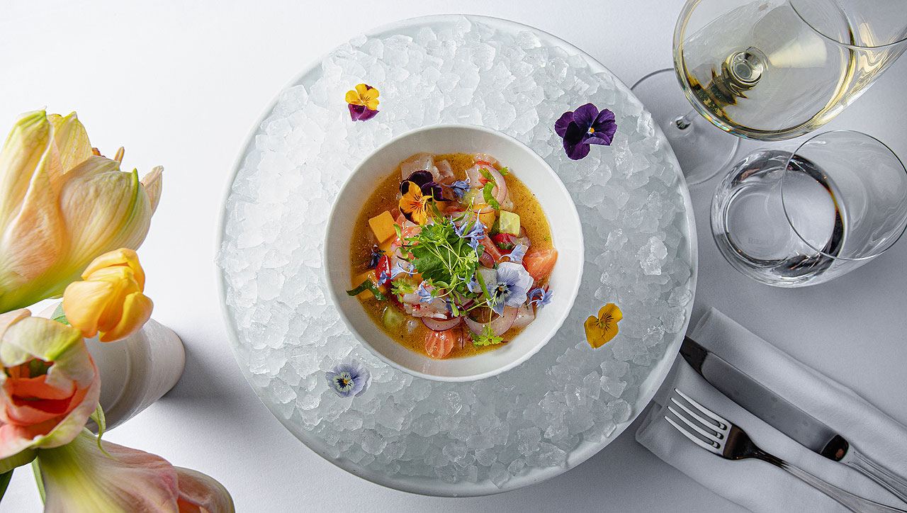 Бруно Марино скоро год как принял в свои руки кухню Due Forni и за это время привнес в меню яркий колорит своей родной Сицилии. Начать рекомендуем с легкой освежающей закуски — тирадито по-сицилийски, в котором сочетаются огурцы, манго, помидоры конкасе, лосось, сибас, красная креветка и пак-чой, заправленные фрешем лайма и апельсина. Подходящим продолжением станет яркий салат с креветками Карабинерос с горохом, оливковым маслом, лимонной цедрой и имбирным соусом. Хороша паста папарделле из шпината с ароматным трюфелем и нежным мясом козленка. Не обойдется и без пиццы из дровяной печи: с двумя видами моцареллы, бурратой, свежей руколой и слайсами пармезана. Основное предложение ресторана дополнено специальным меню сморчков и спаржи. Идеальным гастрономическим сопровождением станет широкий выбор изысканных вин и коктейлей, среди которых находкой может стать Bellini с пюре из белых персиков.