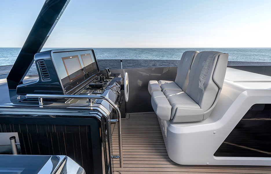 Из-за своих размеров флайбридж мог бы показаться массивным. Сальветти удалось избежать этого впечатления, разместив посередине высокий карбоновый хардтоп на элегантных опорах. При желании в крышу можно встроить жалюзи.