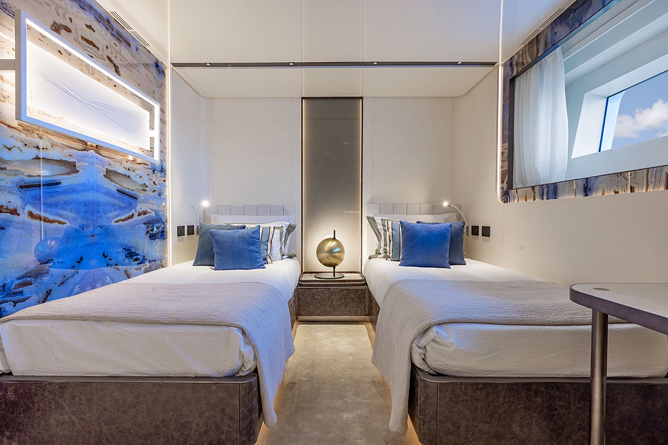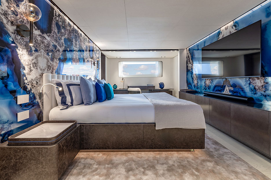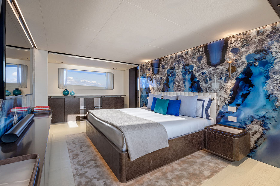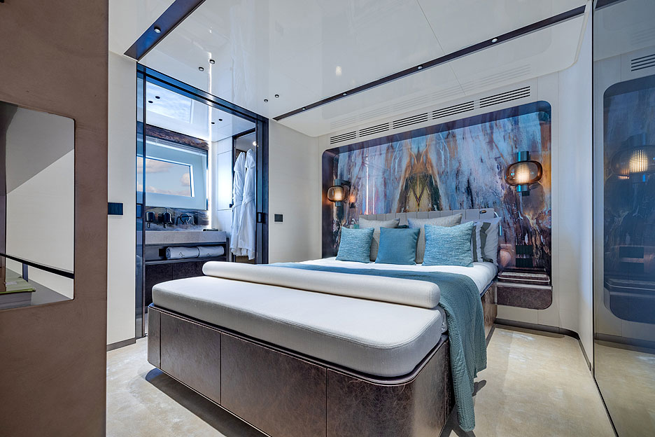 Как и в четырех гостевых суитах палубой ниже, акцентные торцевые стены в мастер-каюте тоже отделаны материалом Vetrite, которому придали сходство с мрамором. Для каждой каюты подобрано своя комбинация цветов, но в целом гамма — морская: в сочетании с белым фоном переборок и потолков насыщенные синие, серые и фиолетовые оттенки наполняют помещения свежестью и энергией водной стихии. Полы везде застелены шелковистым ковролином, светло-бежевый тон которого напоминает песок мальдивских пляжей. Дополняют образ роскошного морского курорта интерьерные украшения из прозрачного голубого стекла, а кожаные вставки на предметах мебели и входные двери кают из металла и стеклопакетов, проложенных металлизированной тканью Aquafil от Syntarqui, придают интерьеру шик джентльменского клуба.