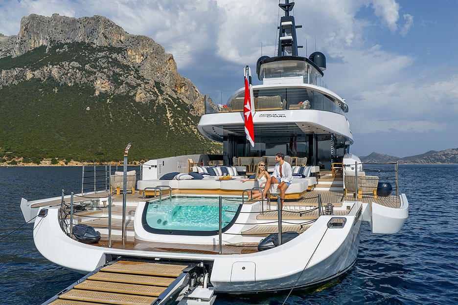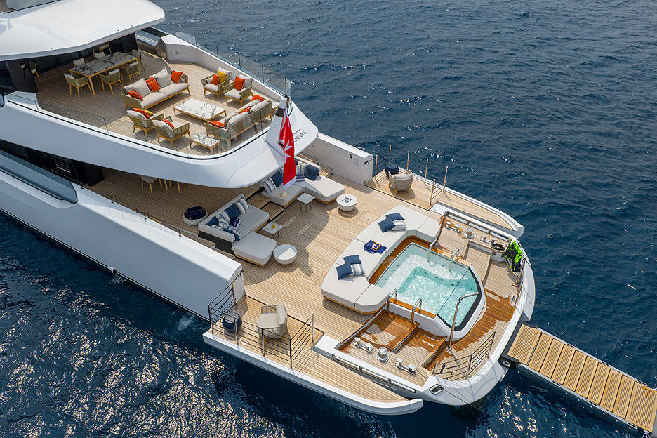 Часть горизонтальной поверхности раскладных кормовых террас при желании огораживается леерными стойками — тогда эти дополнительные площади служат не просто пляжем, с которого удобно прыгать в море, но и безопасными балконами, куда выставляют мягкие кресла и кофейные столики.