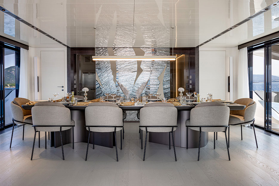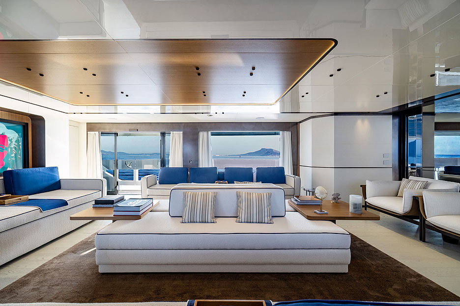 Большой салон на главной палубе встречает гостей лаунжем с креслами Fendi Totu и кастомными белыми диванами: три установлены по периметру и один в центре — он ориентирован на две стороны, позволяя общаться или играть в настольные игры нескольким группам людей. 75-дюймовый телевизор встроен в стеклянную панель Stopsol и в выключенном виде не бросается в глаза.