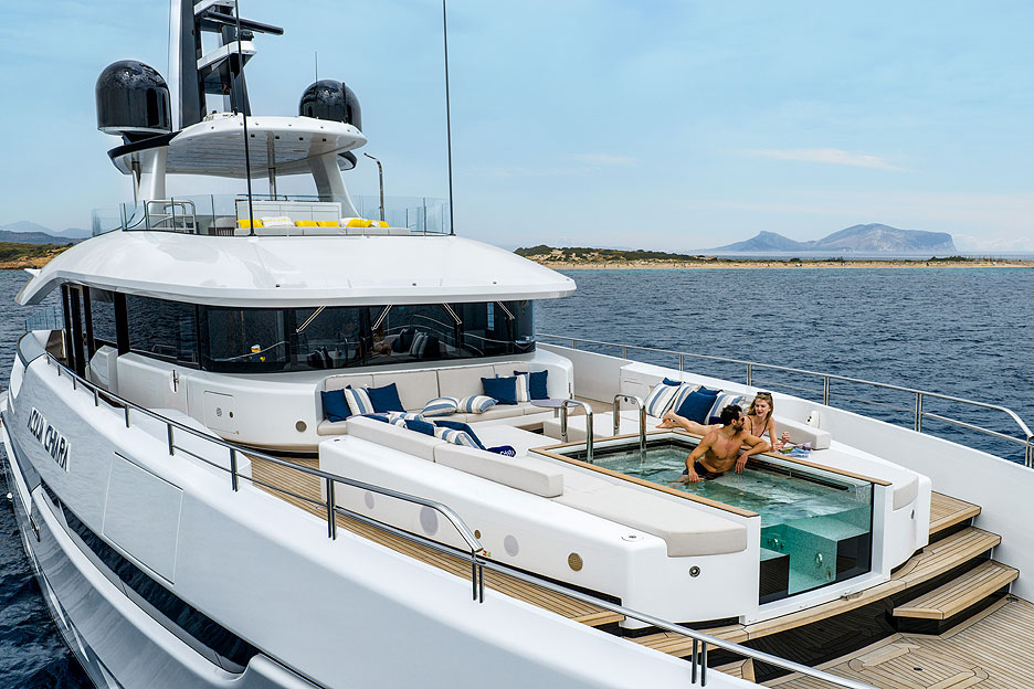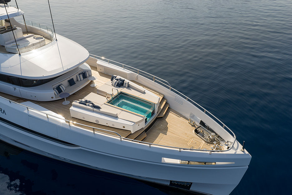 В экстерьере яхты заметны и спортивные черты, и такие характерные признаки эксплорера, как мускулистый корпус со слегка удлиненной свободной кормой и вертикальным остеклением рулевой рубки. К фирменному стилю Columbus Yachts можно отнести трехъярусную конструкцию кормы, которая включает в себя обеденную зону под навесом, лаунж с откидными бортами у бассейна и плавательную платформу, расположенную всего в 50 сантиметрах над уровнем воды. Интересно, что из-за ступенчатой, террасной архитектуры транца как такового нет, его роль визуально берет на себя прозрачная задняя стенка бассейна.