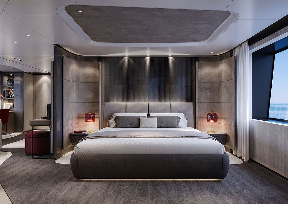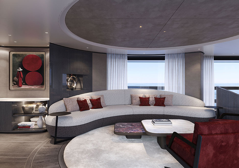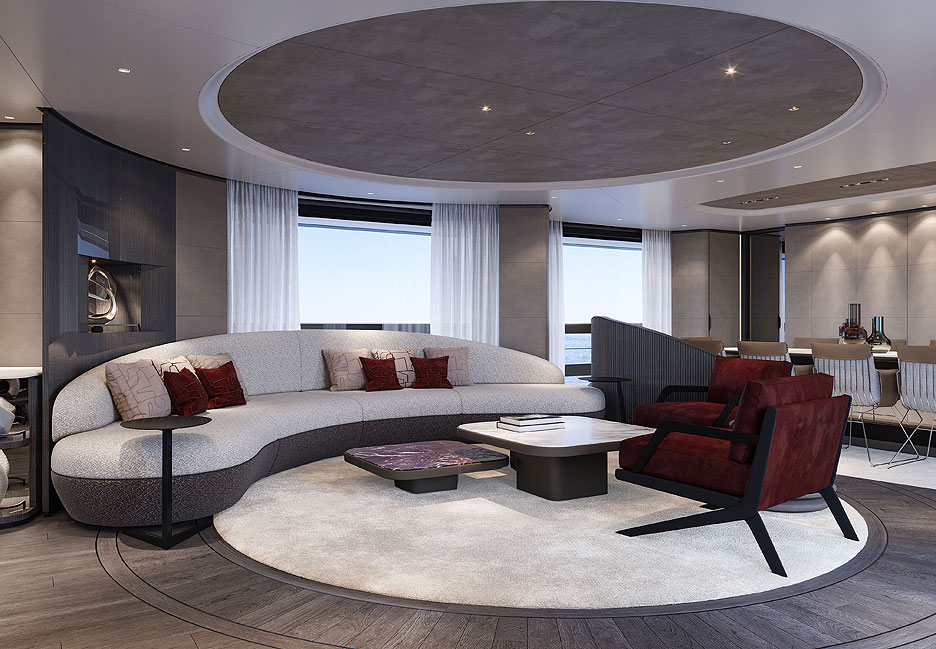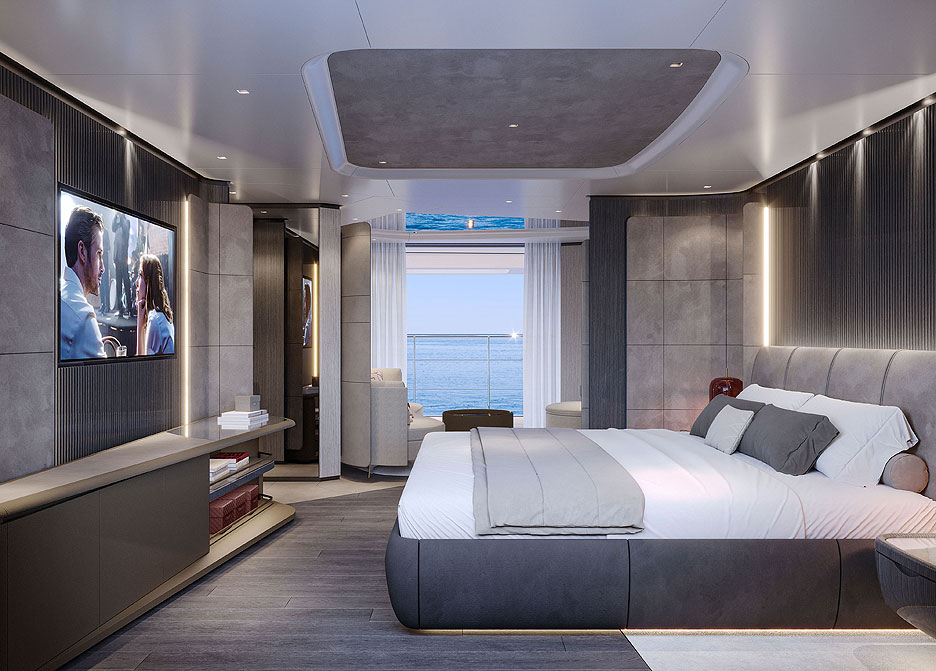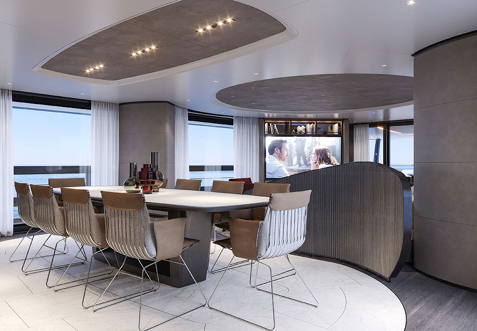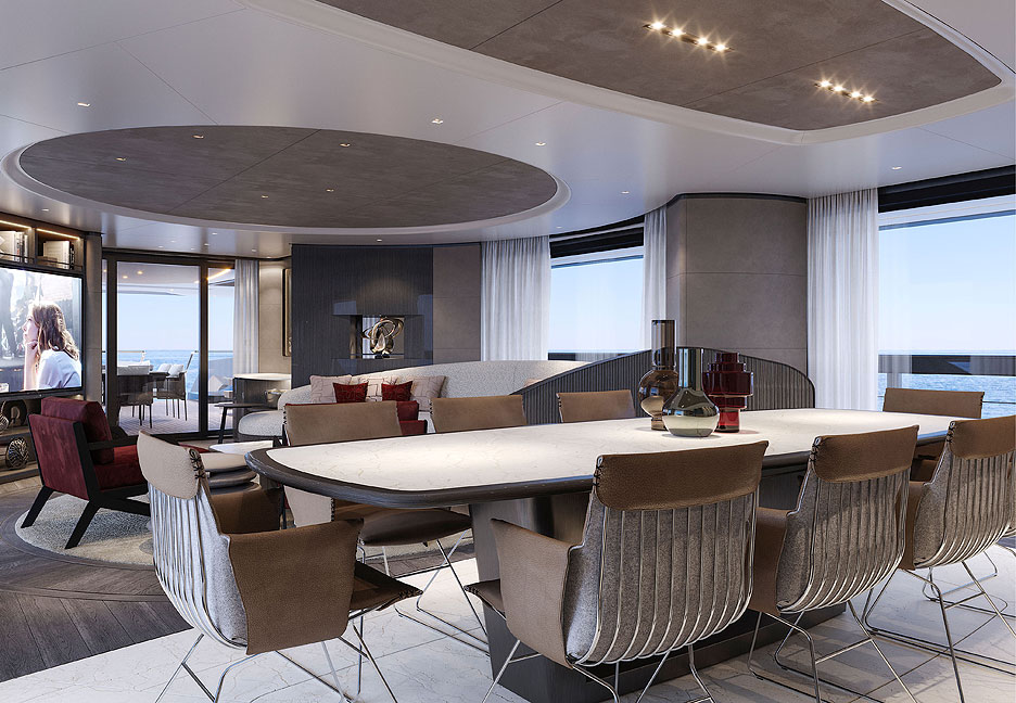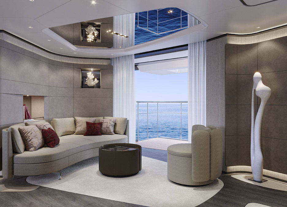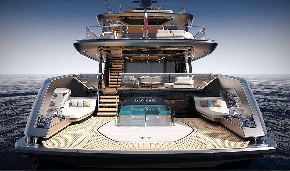 Кормовая часть представляет собой открытую двухуровневую пляжную зону с раскладными платформами для прямого доступа к воде. Загорайте на шезлонгах, потягивайте коктейли в баре, а потом ныряйте в прозрачный бассейн внизу. Какое наслаждение! На сандеке предусмотрены бассейн-инфинити, где горизонт сливается с морской гладью, обеденная зона для вечеринок под звездами и огромная площадка для принятия солнечных ванн. Места хватит всем. Кран для тендеров спрятан в носу, трап элегантно встроен в кормовую платформу, а лестницы перенесены, чтобы освободить еще больше места для релакса. Для водных игрушек нашлось укромное место на верхней палубе.