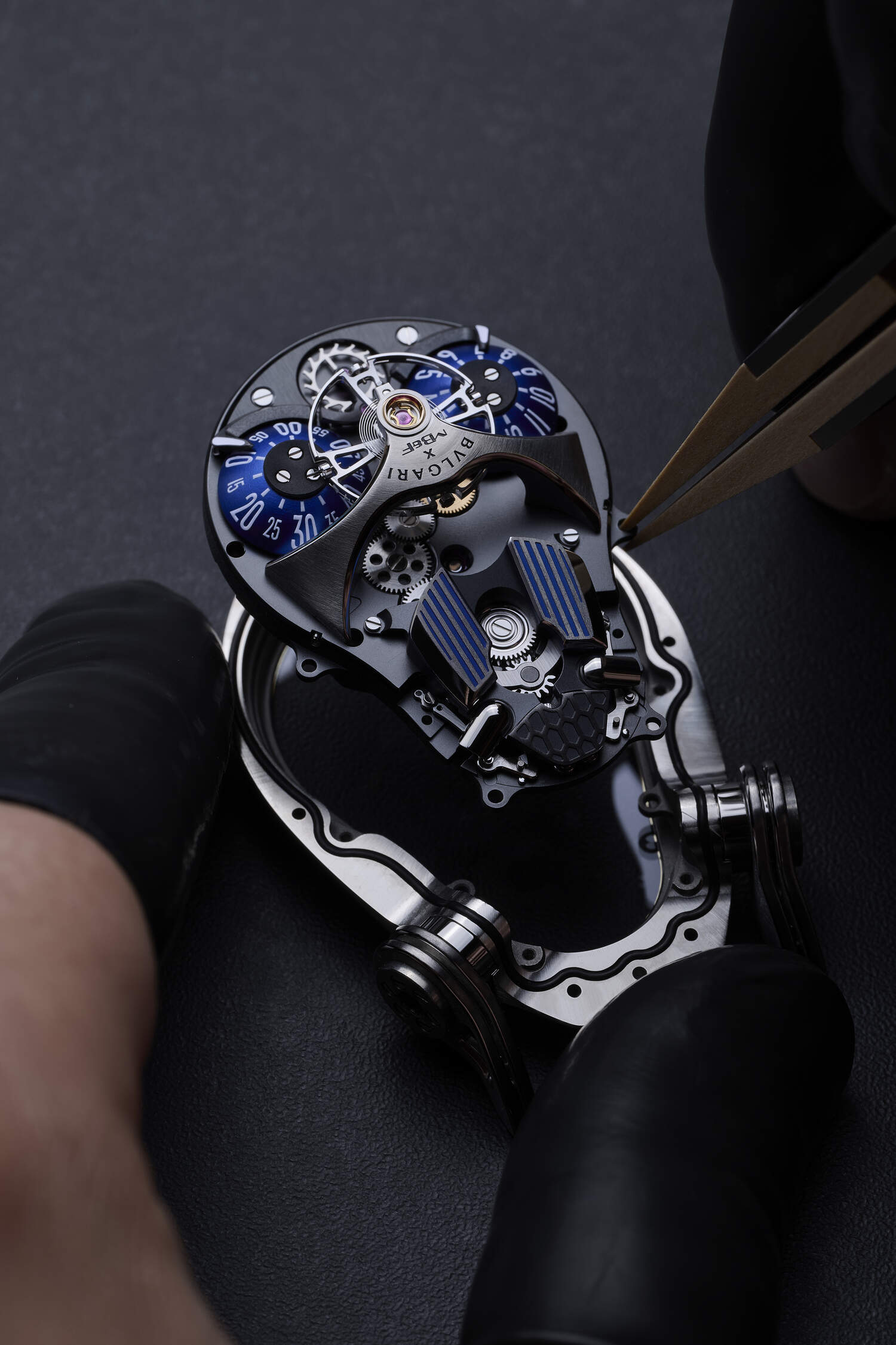 С обратной стороны этой «машины» виден индикатор запаса хода, а также некоторые из 310 компонентов механизма с ручной отделкой. MB&F – один из немногих производителей, сохраняющих ремесленный подход к изготовлению и ручной отделке деталей. Ежемесячно мастера MB&F способны изготовить и собрать только шесть-восемь механизмов Bvlgari x MB&F Serpenti, так что на производство 99 экземпляров уйдет больше года.