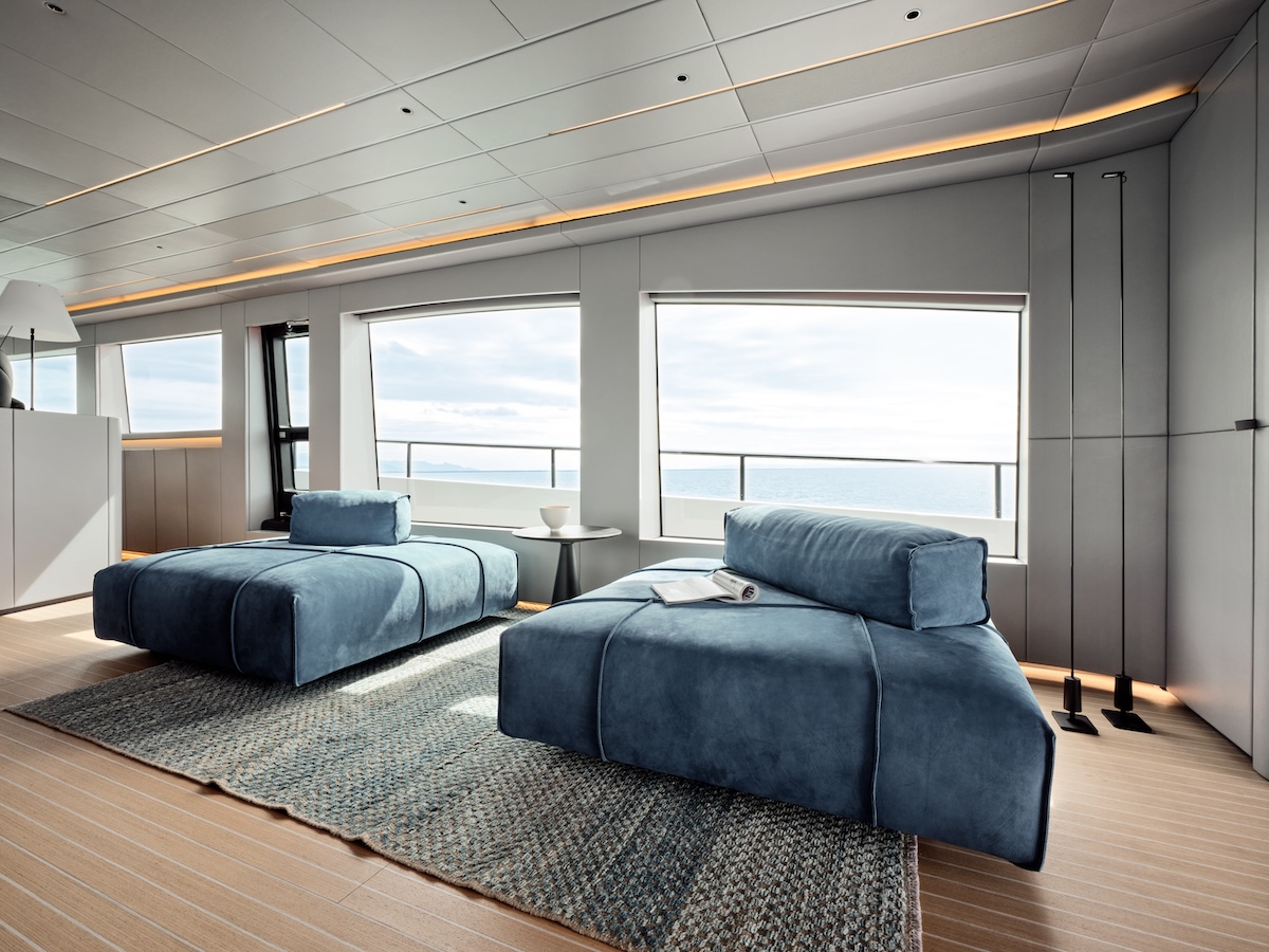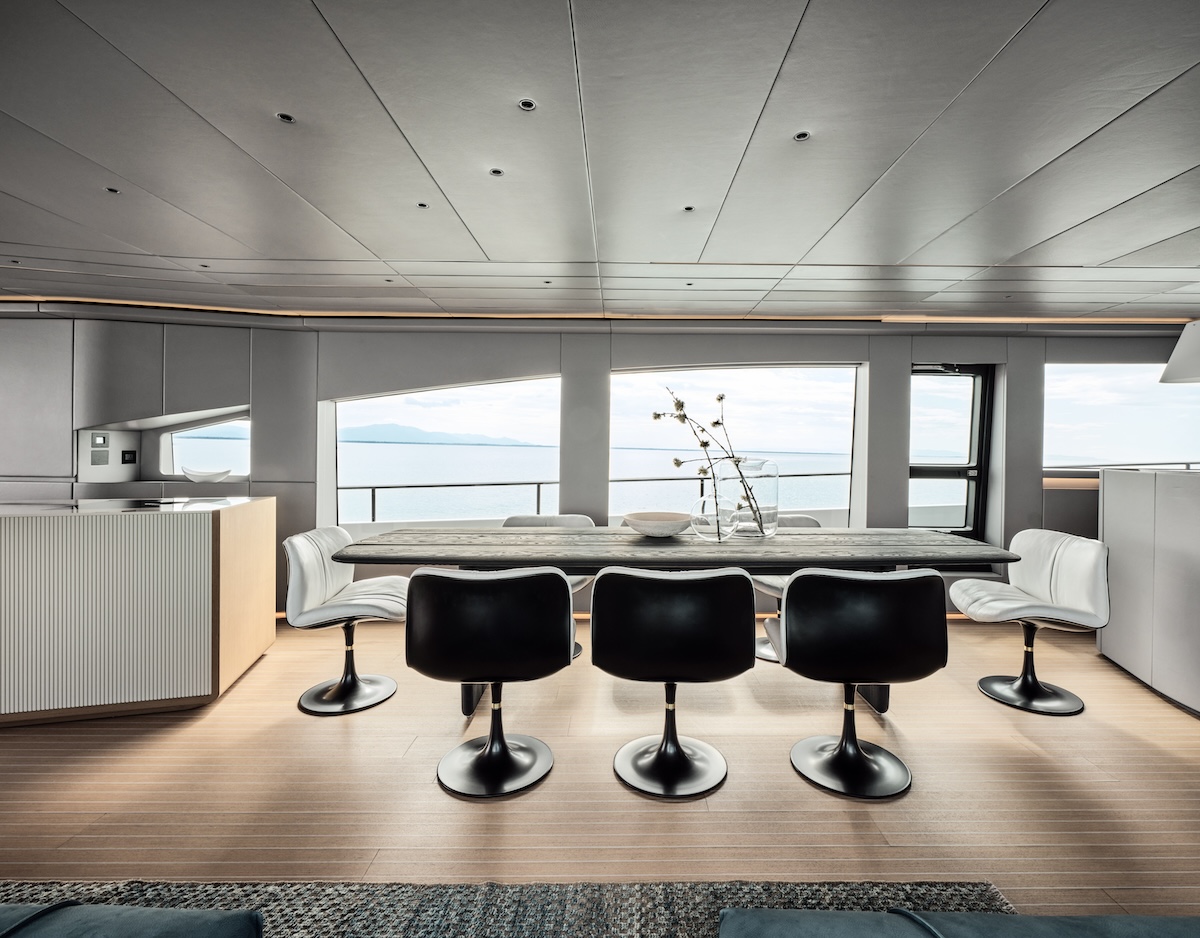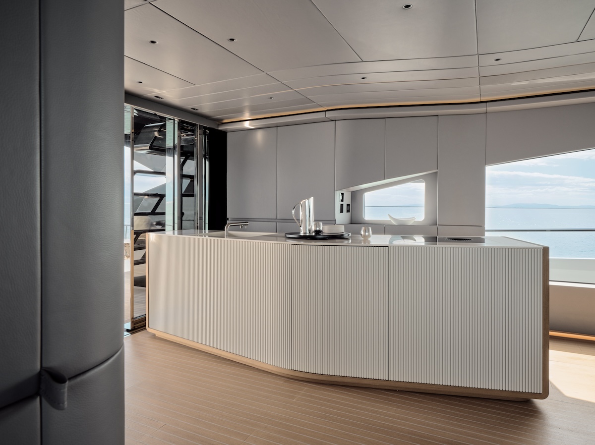 Полы из тика объединяют салон с кокпитом, создавая ощущение непрерывного пространства. Панорамные окна от пола до потолка можно открыть, чтобы впустить в салон свежий бриз и свободно перемещаться между открытыми и закрытыми пространствами. Отдельным произведением дизайнерского искусства можно считать кухонную зону: изогнутый бар с рифлёной отделкой и почти бесшовной столешницей выглядит как скульптурный элемент, плавно парящий над полом.