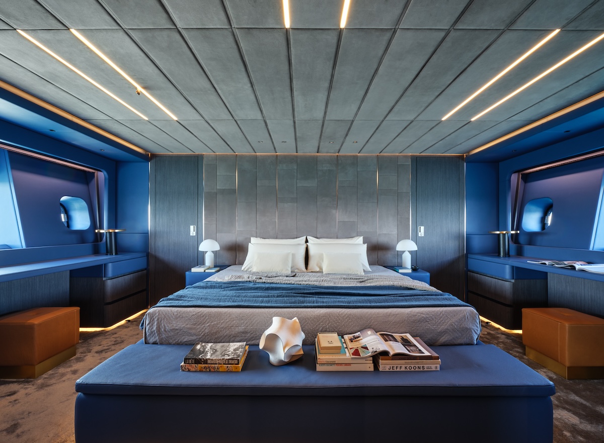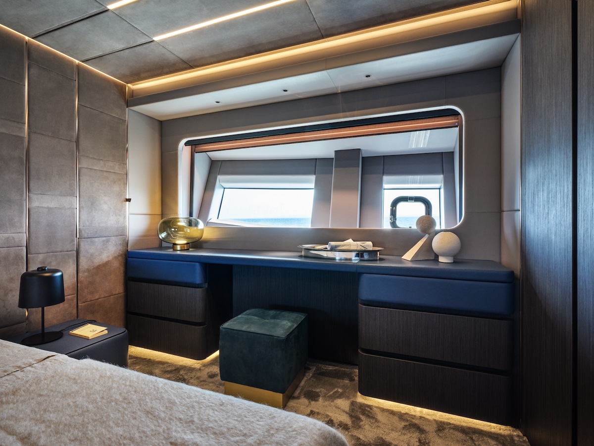 Дизайн интерьера и экстерьера разработан студией Archea Associati под руководством Марко Казамонти. Пространства внутри яхты напоминают стильный лофт, где гармонично сочетаются свет, линии и детали. Рулевая рубка — это шедевр технологий и эстетики: большие сенсорные дисплеи, подсветка, меняющая цвет по мере увеличения скорости, и ультралёгкое атермальное стекло, которое вносит свой вклад в сохранение прохлады, снижая нагрузку на систему кондиционирования.