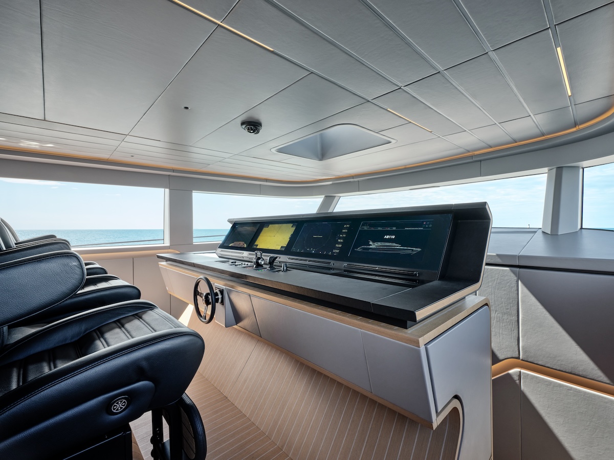 Новая модель сразу же обращает на себя внимание обратным наклоном стекол рулевой рубки, как на экспедиционных яхтах. Эти окна не просто наделяют AB110 яркой индивидуальностью и улучшают обзорность с поста управления. За счет обратного наклона на них не бывает бликов, а также попадает меньше солнечного света, что уменьшает нагрев. Кроме того, они указывают на неочевидную на первый взгляд особенность этой яхты — удлиненный, а значит и более просторный флайбридж».