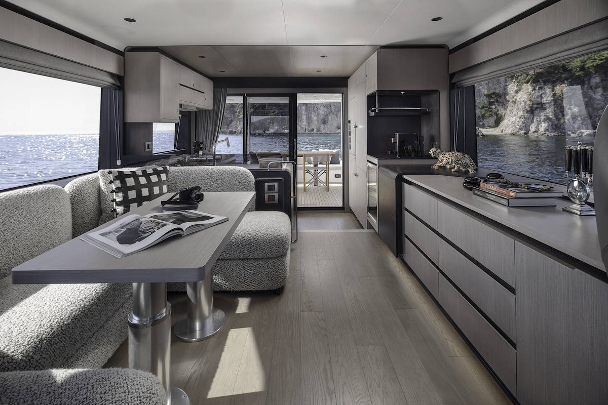 Более рациональное использование пространства позволило дизайнерской команде выделить больше внутреннего объема для ключевых элементов, обеспечивающих комфорт на Sirena 60. Войдя через широкие раздвижные двери на корме, вы первым делом увидите кухню, площадь которой увеличилась почти на 20% и теперь составляет 5 квадратных метров. Это означает больше рабочих поверхностей и места для хранения продуктов и посуды. Также доступен вариант с холодильником для вина наряду с другими премиальными бытовыми приборами.