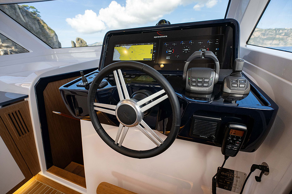 Интерьеры Gozzo 48 Cabin обеспечивают плавный переход между кокпитом и внутренними помещениями. Большие окна наполняют пространство кабины естественным светом, а отделка выполнена из высококачественных материалов — дерева, тканей и кожи — в сочетании с дизайнерскими декоративными элементами. Внутри гостей ждут уютная динетта с раскладным столом и диваном, соединенным с креслом капитана, а также полностью оборудованный камбуз длиной более 2,8 м — самый большой в классе, если верить Apreamare.