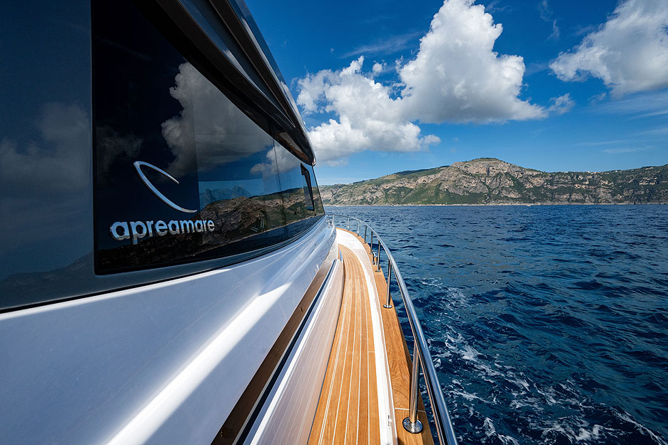 Отделанная тиком корма закруглена. Эта особенность — дань традиции «гоццо соррентино». На такую очаровательную винтажность легко западаешь. Слева от кормового дивана есть дверь, ведущая на купальную платформу. Купальная платформа расположена чуть выше ватерлинии, тоже закруглена и выдается далеко назад, как принято у яхт Apreamare. Большая часть платформы погружается в воду.