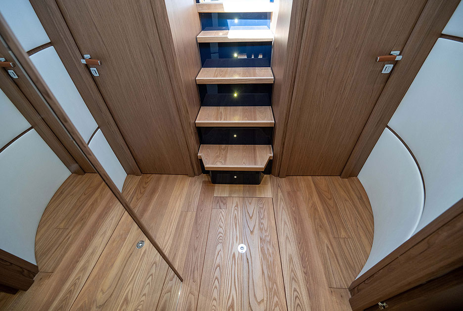 Слева от панели управления расположен спуск на нижнюю палубу. На ней можно спланировать две или три каюты с отдельными душевыми. Мастер‑каюта с двуспальной кроватью занимает нос судна, а в середине корпуса расположены две каюты с односпальными кроватями или одна каюта и динетта. В кормовой части также можно оборудовать каюту для капитана с доступом из кокпита.