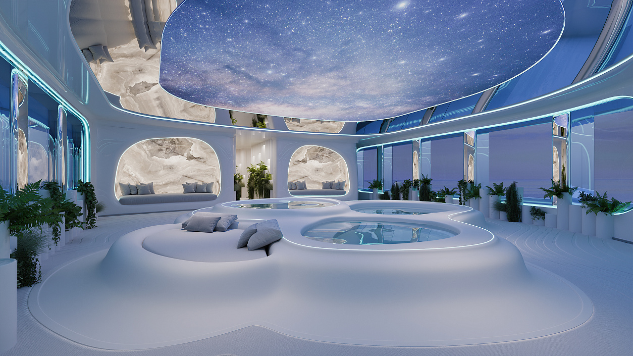 На борту доступны гипербарическая оксигенация, криотерапия, инфракрасные сауны, гималайские соляные комнаты, внутривенные инфузии, капсулы для медитации и среды с искусственным интеллектом, которые адаптируются к предпочтениям гостей в реальном времени. Циркадное освещение, низкий уровень электромагнитных полей, HEPA-фильтрация воздуха и концепция «оздоровительной лаборатории» способствуют улучшению сна, энергии и когнитивных функций.